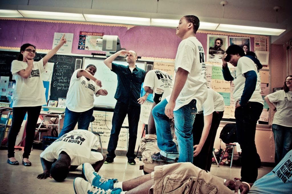 Part of the Comedy Hall of Fame Laugh It Out Program, students from Queens Preperatory Academy perform with Ted Alexandro when he visited classes taugh by Walt Frasier.
